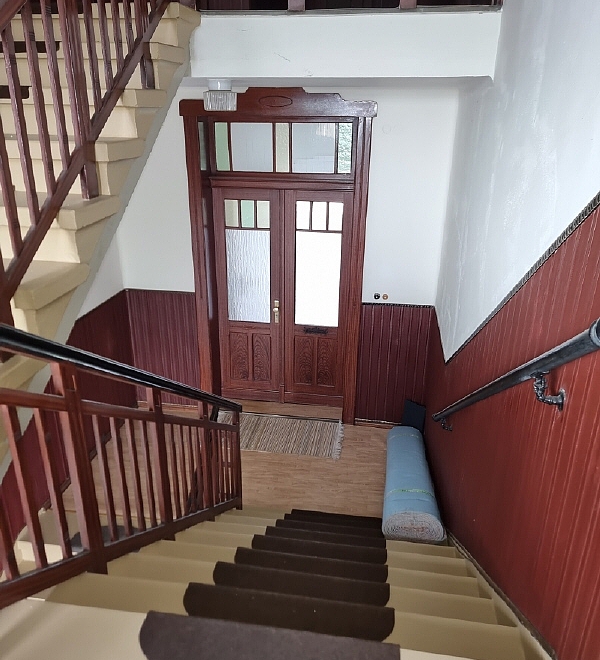 Da die Fassade des Hauses unter Denkmalschutz steht ,wurden bei der Sanierung die alten Fenster nur aufgearbeitet.